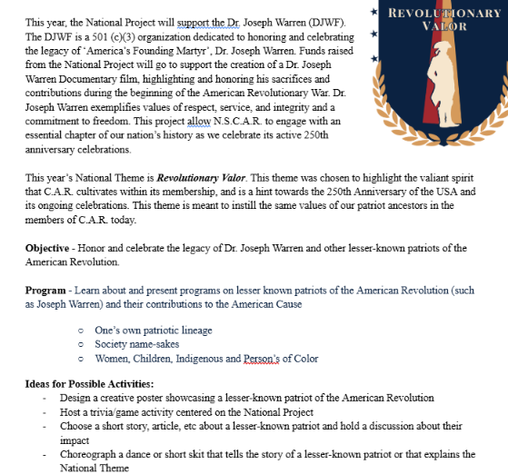 I planned/headed a project to create and publish a pamphlet for the National Society Children of the American Revolution to use in education initiatives about lesser-known patriots of the American Revolution, including patriots of color, women, and children.