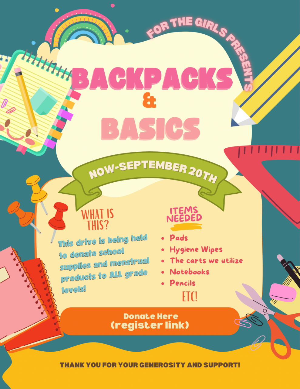 - Running a donation drive for school supplies and menstrual hygiene products for K-12 schools in my area. My passion project—#FortheGirls—has received over 1,000 pads in support from a non profit organization and plan to store hygiene boxes inside our local CMS libraries along with flyers to gain more donations.