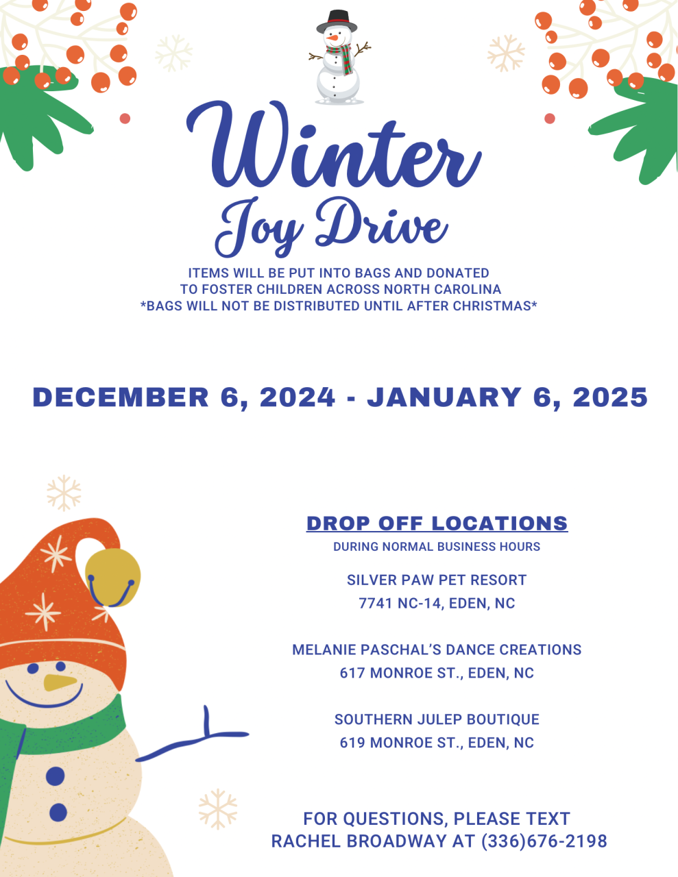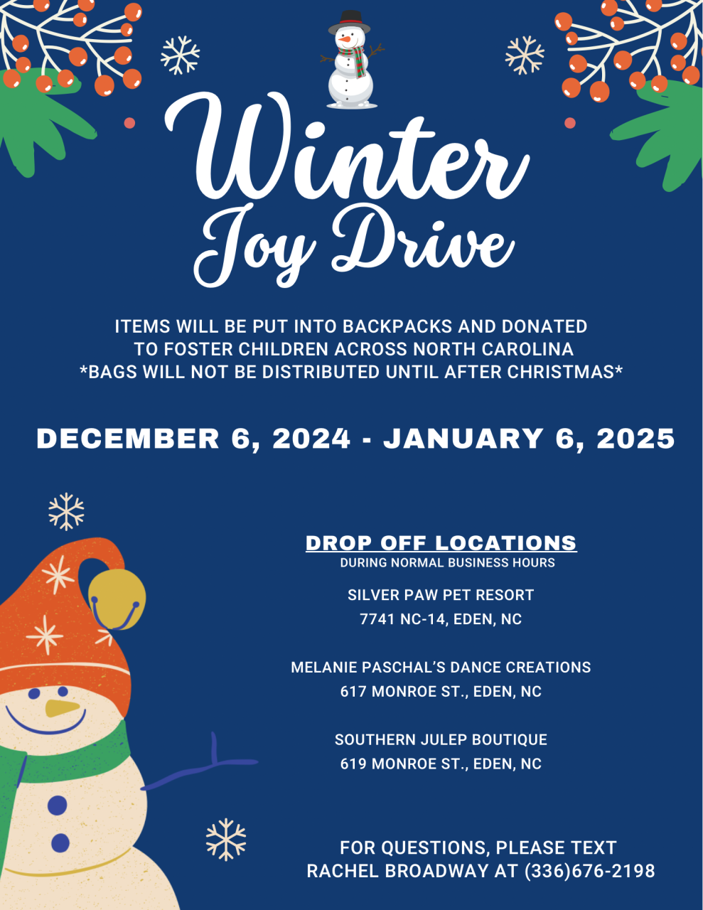 The Winter Joy Drive had collection locations at Southern Julep Boutique (619 Monroe St., Eden), Silver Paw Pet Resort (7741 NC-14, Eden), and Melanie Paschal's Dance Creations (617 Monroe St., Eden).