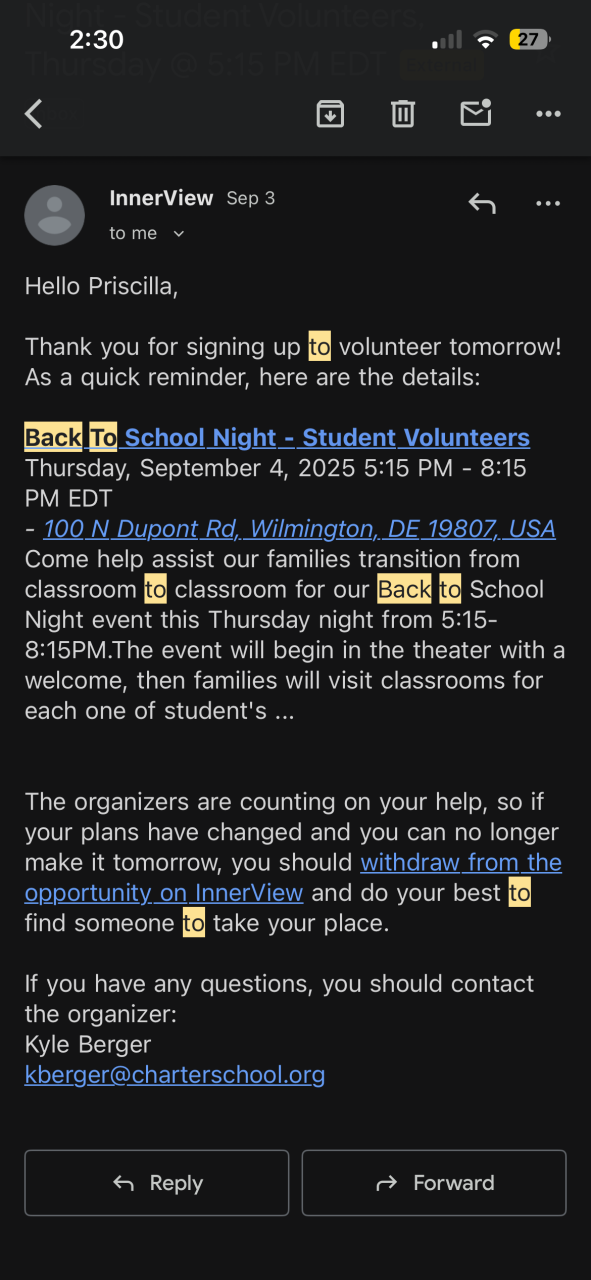 Back To School Night - Student Volunteers