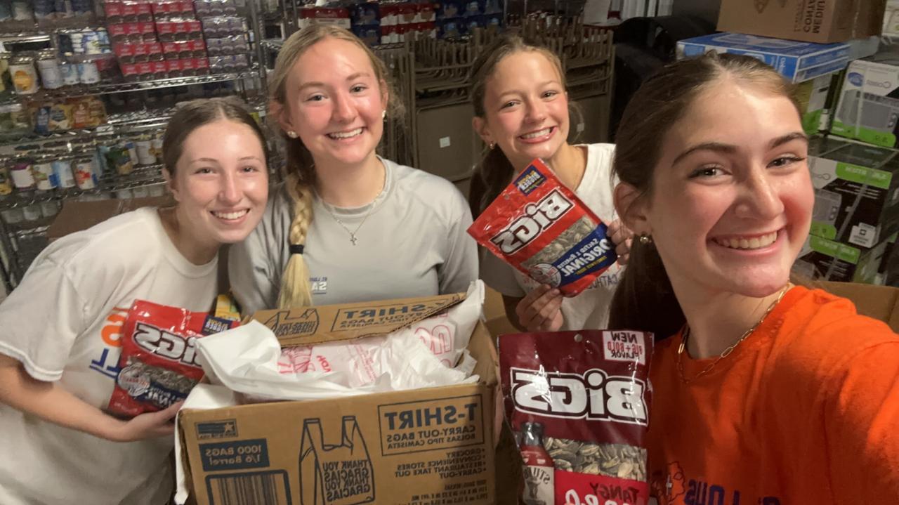 Pack food bags at Catholic Charities