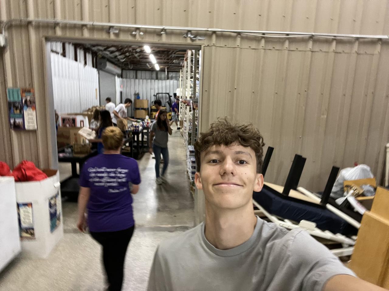 Pack food bags at Catholic Charities