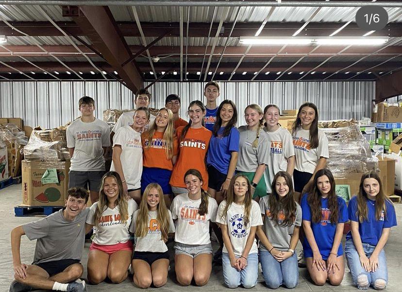 Pack food bags at Catholic Charities